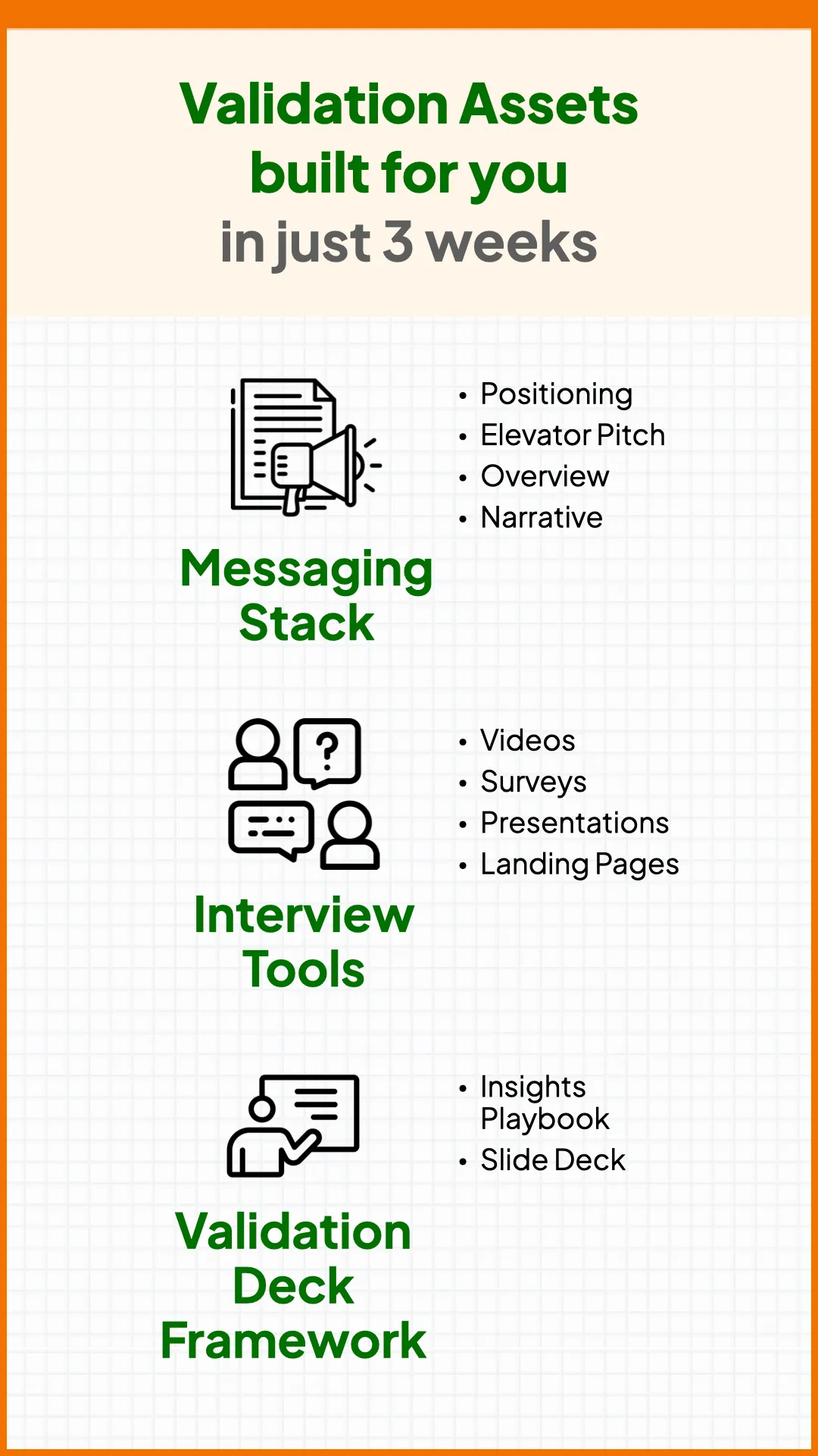In just 3 weeks, we create your core messaging, interview tools, and validation deck framework — everything you need to collect clean demand signals.