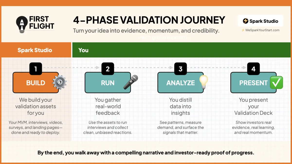 ⚡️ In just 3 weeks, you'll go from “idea in your head” to having professionally crafted validation assets that are ready for real-world testing.